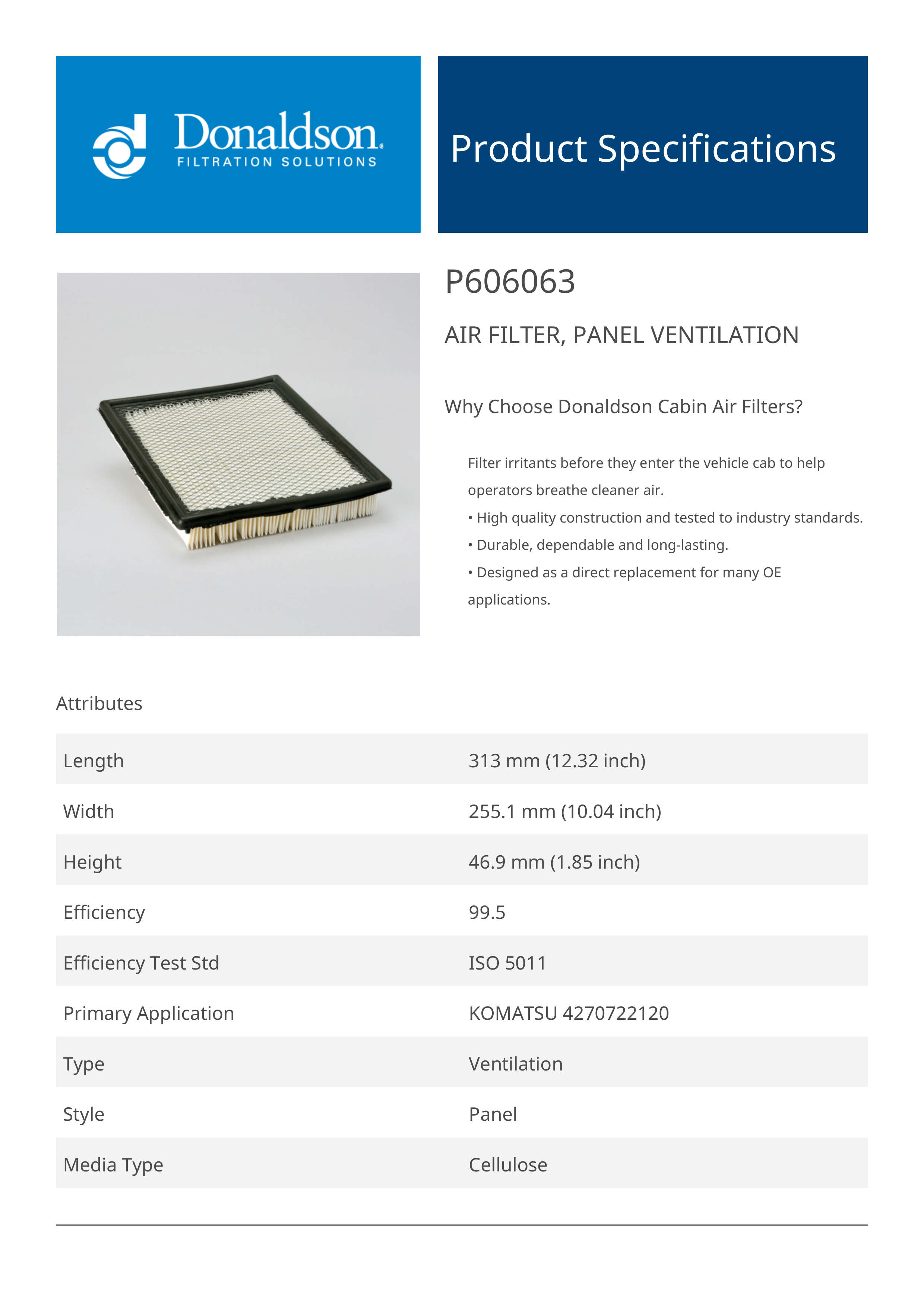 Why Choose Donaldson Cabin Air Filters?Filter irritants before they enter the vehicle cab to help operators breathe cleaner air.