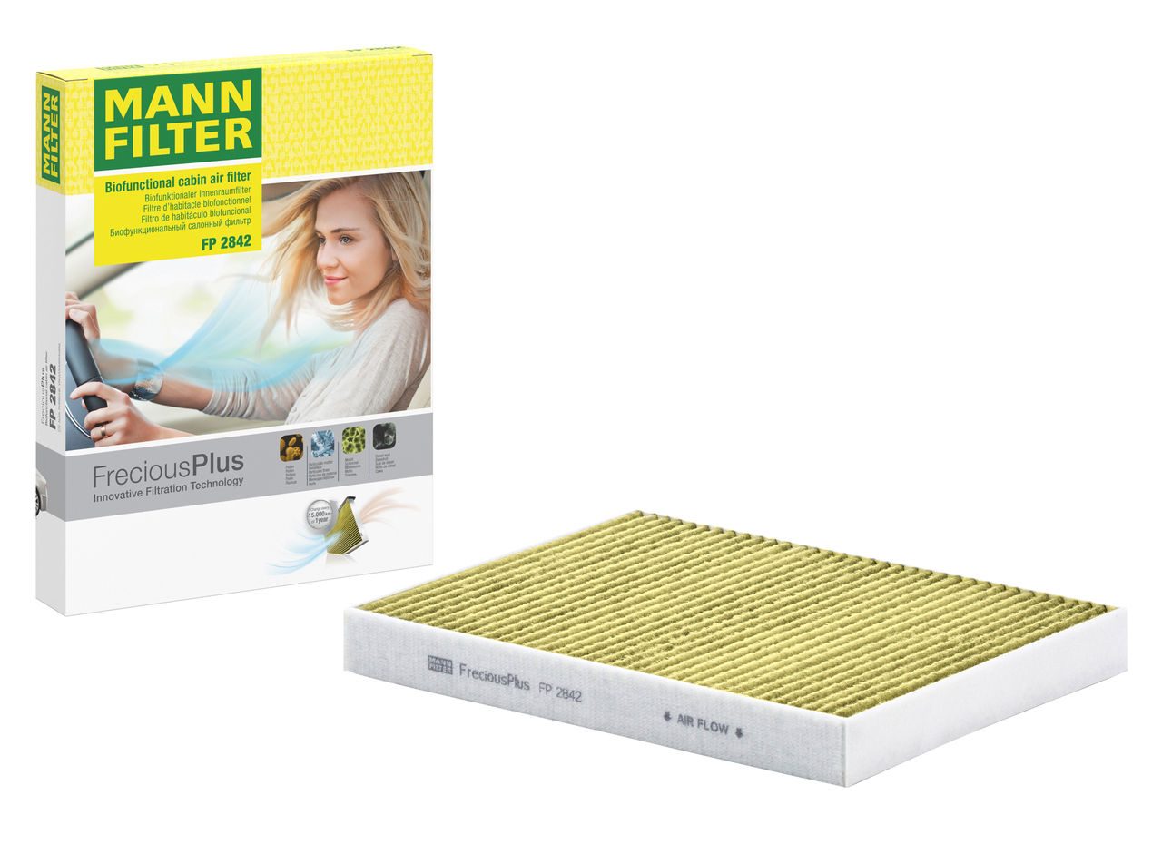 Biofunctional MANN-FILTER FreciousPlus cabin air filters - nearly 100% protection against nitrogen oxides, dust, allergens and mould - harmful gases and unpleasant odours are also eliminated and virus aerosols filtered. The three-layer filter technology absorbs almost 100% of allergens, reduces the growth of molds and bacteria by more than 98% and stops fine dust almost completely.Specification