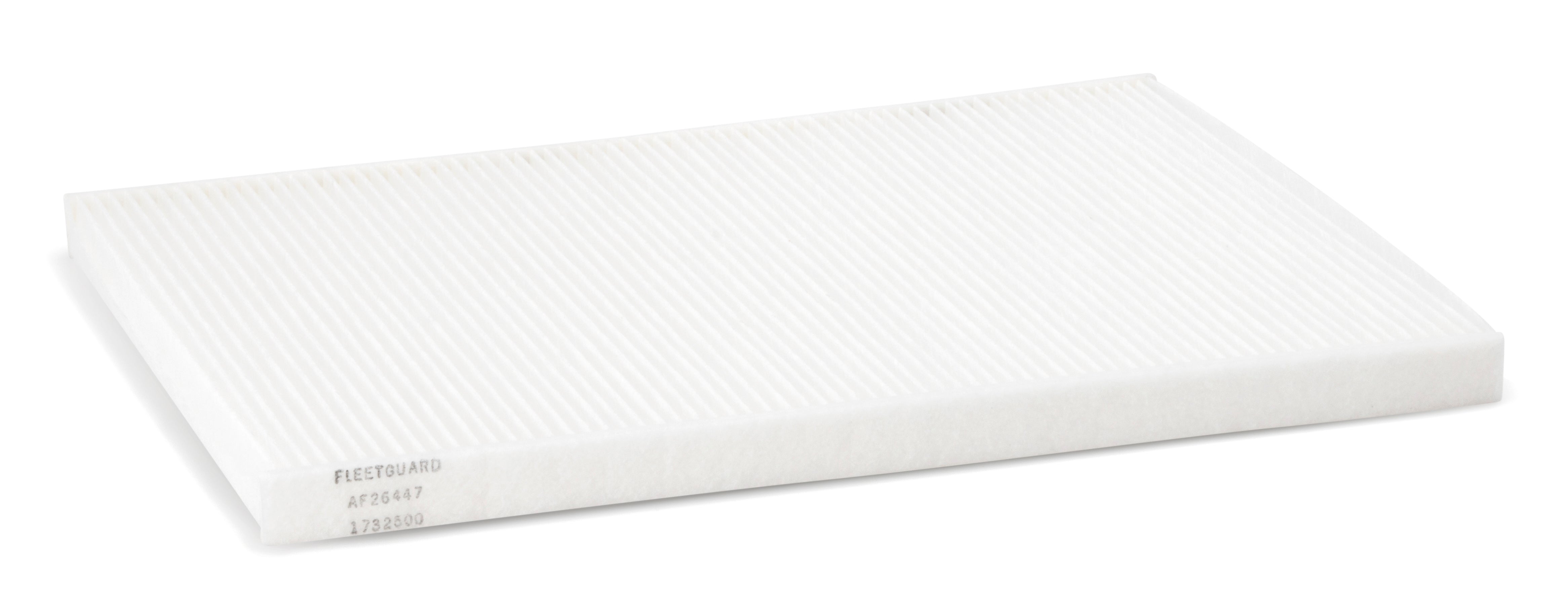 Fleetguard® AF26447 panel cabin air filter provides clean air in the cab which means a clean work environment. Breathing cleaner air can lead to longer and more productive working hours.