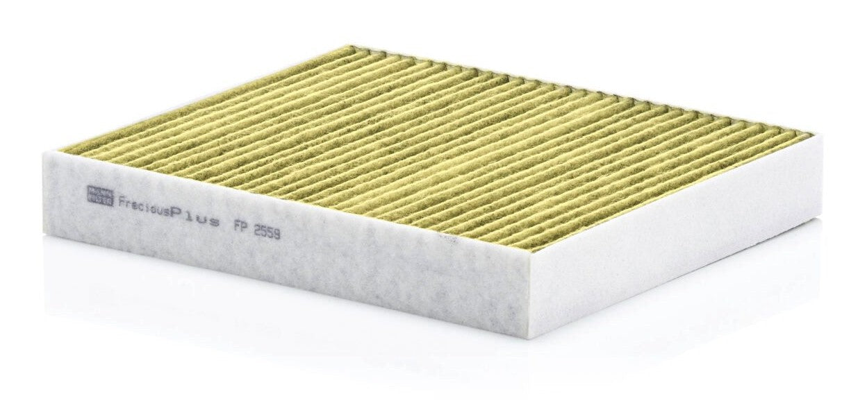 Biofunctional MANN-FILTER FreciousPlus cabin air filters - nearly 100% protection against nitrogen oxides, dust, allergens and mould - harmful gases and unpleasant odours are also eliminated and virus aerosols filtered. The three-layer filter technology absorbs almost 100% of allergens, reduces the growth of molds and bacteria by more than 98% and stops fine dust almost completely.Specification