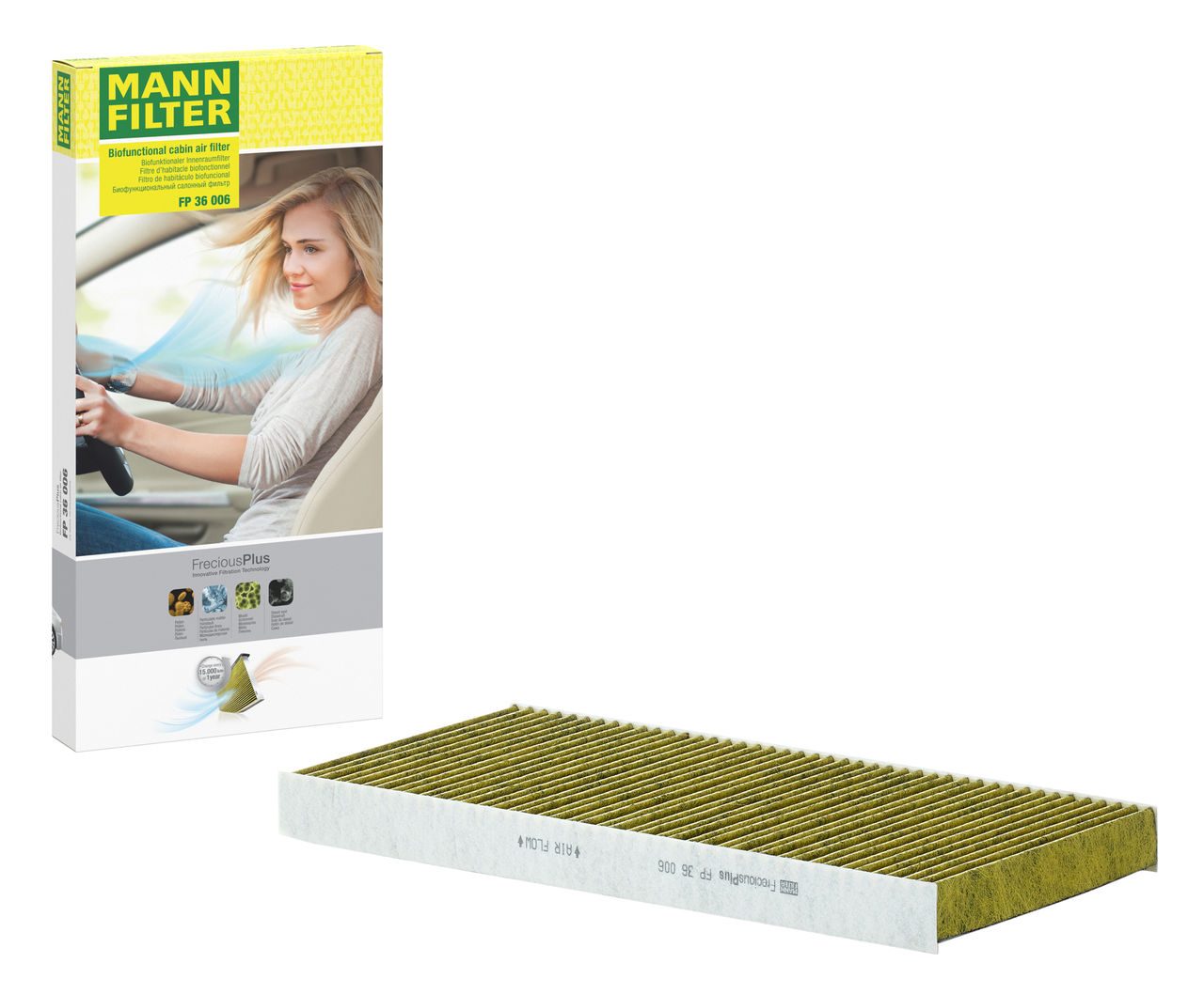 Biofunctional MANN-FILTER FreciousPlus cabin air filters - nearly 100% protection against nitrogen oxides, dust, allergens and mould - harmful gases and unpleasant odours are also eliminated and virus aerosols filtered. The three-layer filter technology absorbs almost 100% of allergens, reduces the growth of molds and bacteria by more than 98% and stops fine dust almost completely.Specification