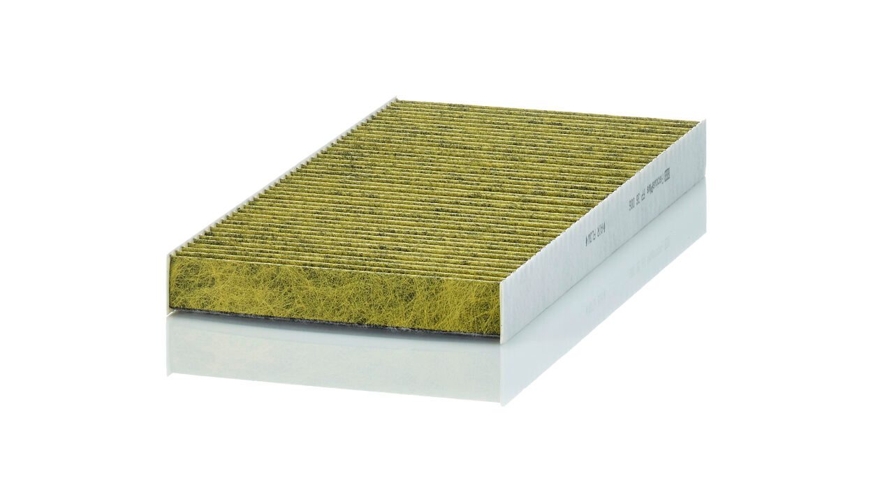 Biofunctional MANN-FILTER FreciousPlus cabin air filters - nearly 100% protection against nitrogen oxides, dust, allergens and mould - harmful gases and unpleasant odours are also eliminated and virus aerosols filtered. The three-layer filter technology absorbs almost 100% of allergens, reduces the growth of molds and bacteria by more than 98% and stops fine dust almost completely.